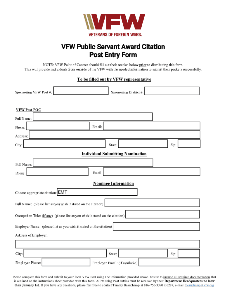 VFW Public Servant Award Citation Post Entry Form NOTE: VFW Point of Contact should fill out their section below prior to distributing this form. This will provide individuals from outside of the