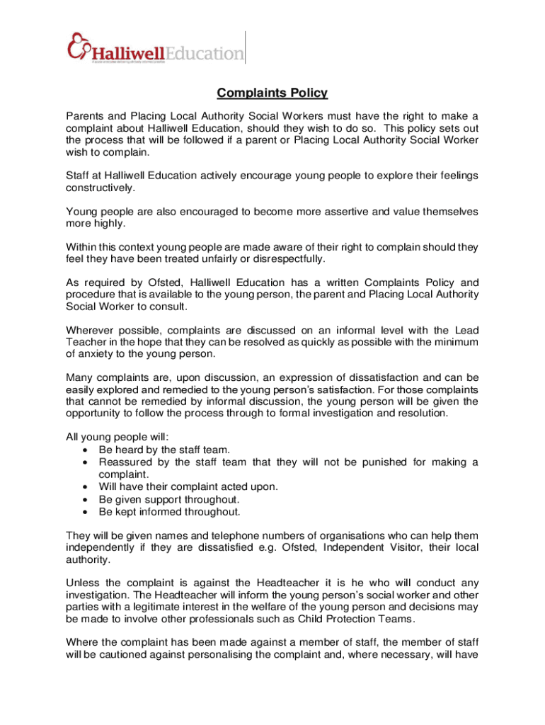 Complaints Policy Parents and Placing Local Authority Social Workers must have the right to make a complaint about Halliwell Education, should they wish to do so. This policy sets out the process