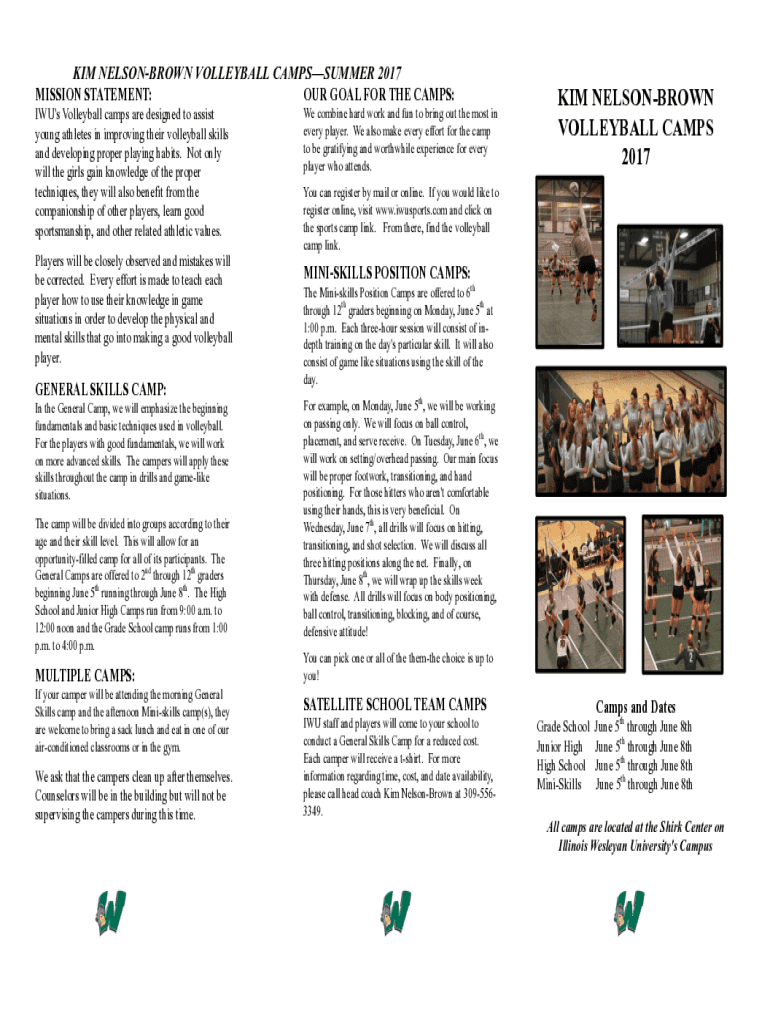 KIM NELSONBROWN VOLLEYBALL CAMPSSUMMER 2017 MISSION STATEMENT:OUR GOAL FOR THE CAMPS:IWU\'s Volleyball camps are designed to assist young athletes in improving their volleyball skills and developing