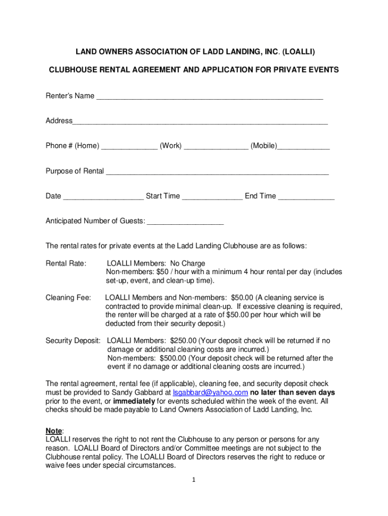 LAND OWNERS ASSOCIATION OF LADD LANDING, INC. (LOALLI) CLUBHOUSE RENTAL AGREEMENT AND APPLICATION FOR PRIVATE EVENTS Renters Name ___ Address___ Phone # (Home) ___ (Work) ___ (Mobile)___ Purpose of