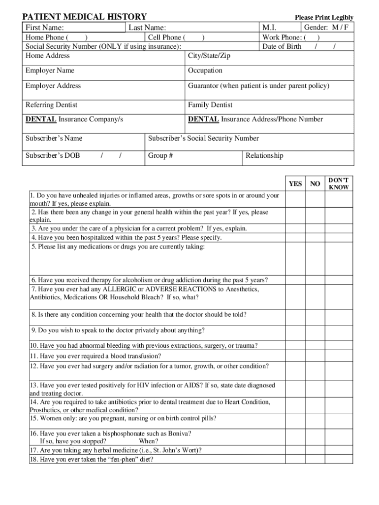 PATIENT MEDICAL HISTORY First Name:Please Print LegiblyLast Name:M.I.Gender: M / F Work Phone: ( ) Date of Birth / /Home Phone ( ) Cell Phone ( ) Social Security Number (ONLY if using insurance):