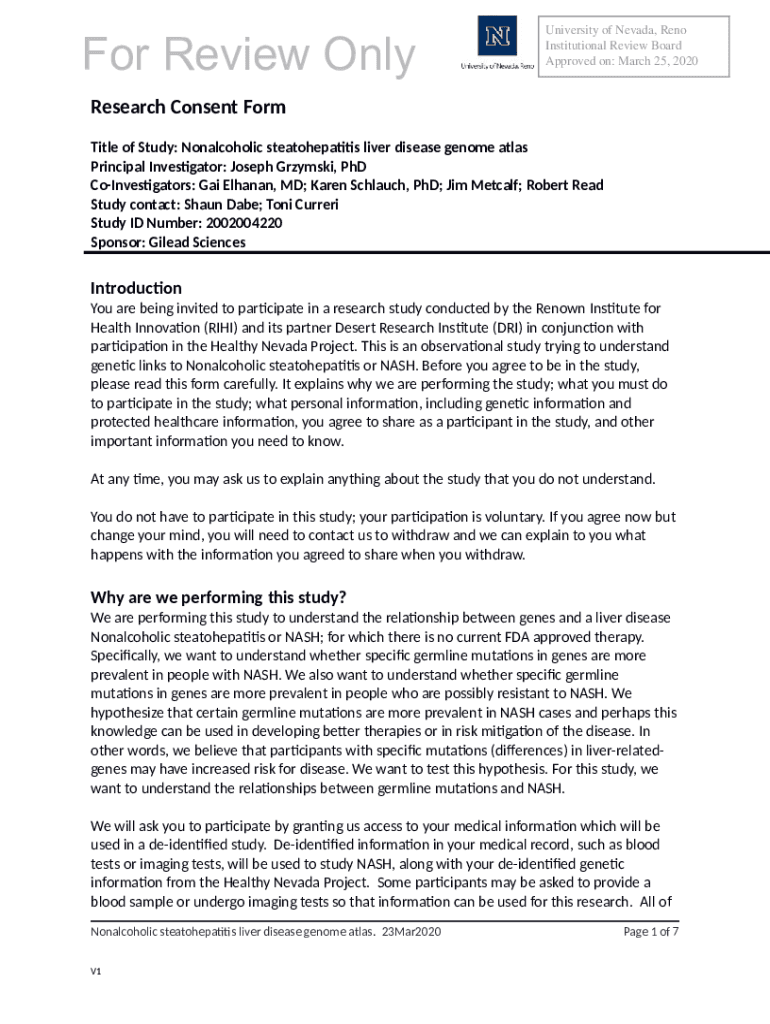 For Review OnlyUniversity of Nevada, Reno Institutional Review Board Approved on: March 25, 2020Research Consent Form Title of Study: Nonalcoholic steatohepatitis liver disease genome atlas Principal