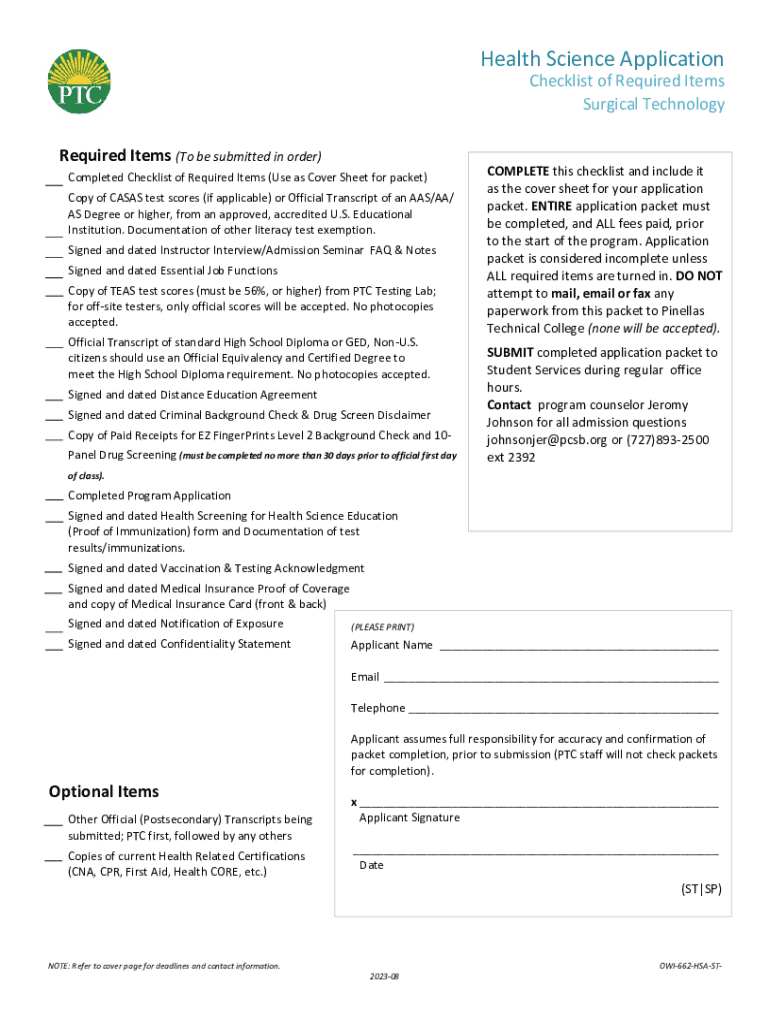 Health Science ApplicationChecklist of Required Items Surgical TechnologyRequired Items (To be submitted in order) Completed Checklist of Required Items (Use as Cover Sheet for packet) Copy of CASAS