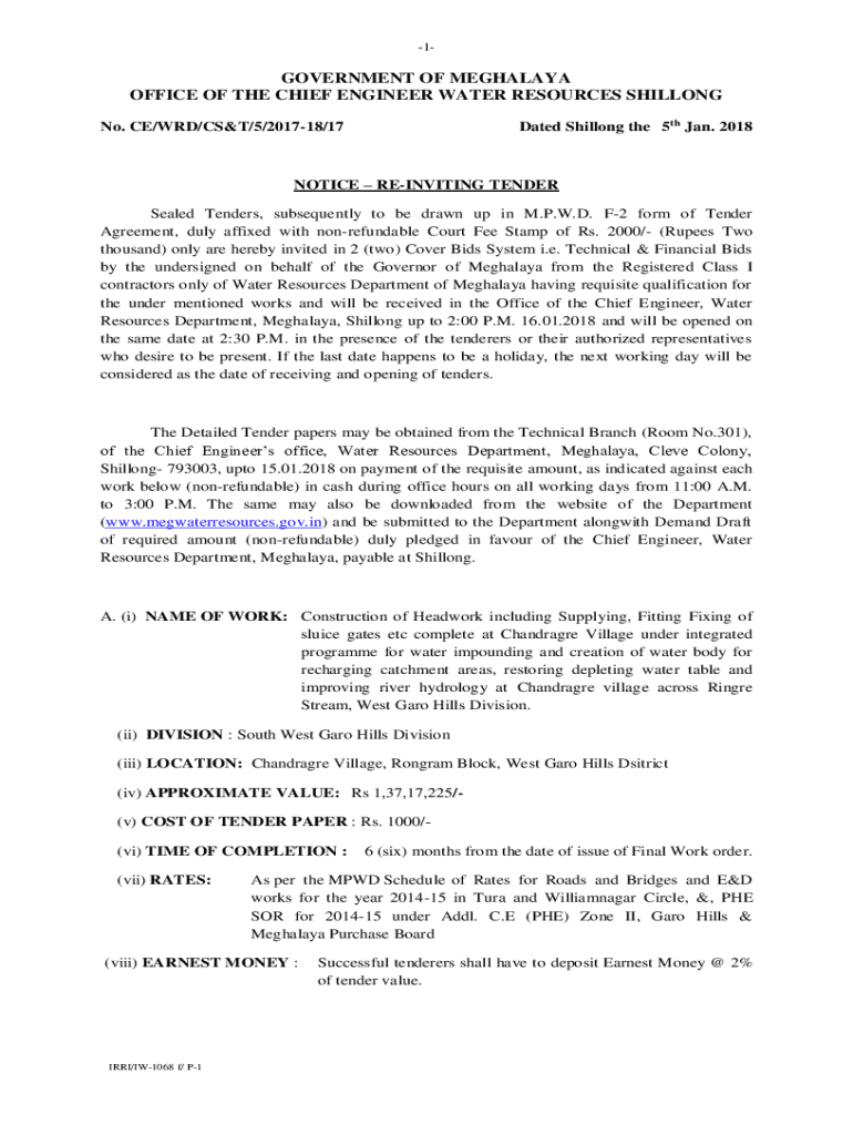 1GOVERNMENT OF MEGHALAYA OFFICE OF THE CHIEF ENGINEER WATER RESOURCES SHILLONG Dated Shillong the 5th Jan. 2018No. CE/WORD/CST/5/201718/17NOTICE INVITING TENDER Sealed Tenders, subsequently to be