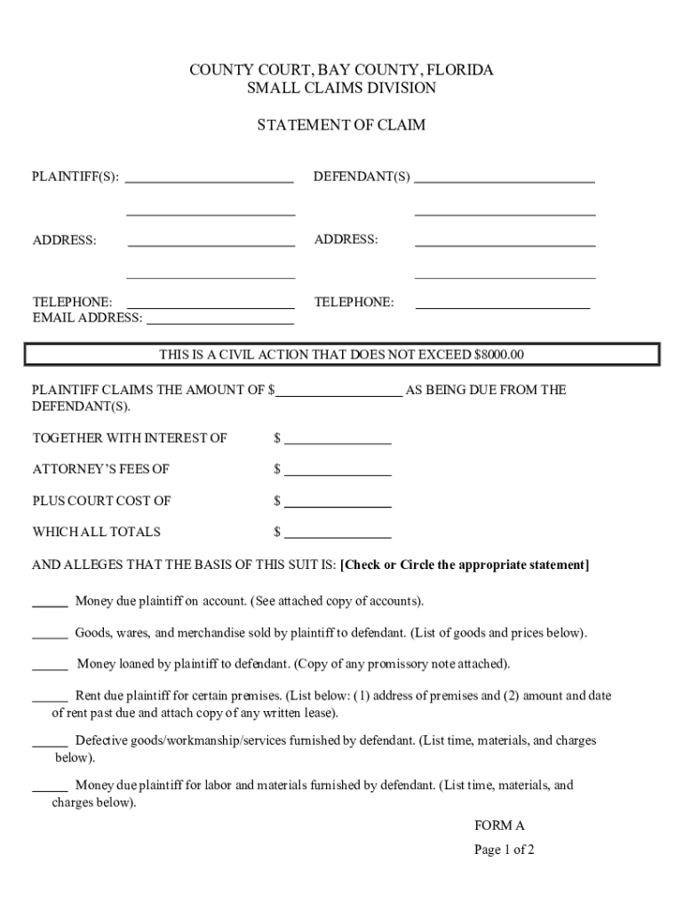 SMALL CLAIMS PACKET Bay County Clerk of Court PO Box 2269 Panama City, Florida 32402 8507475141 www.baycoclerk.com *NOTICE* Information or forms provided by the Clerk of Court should be considered