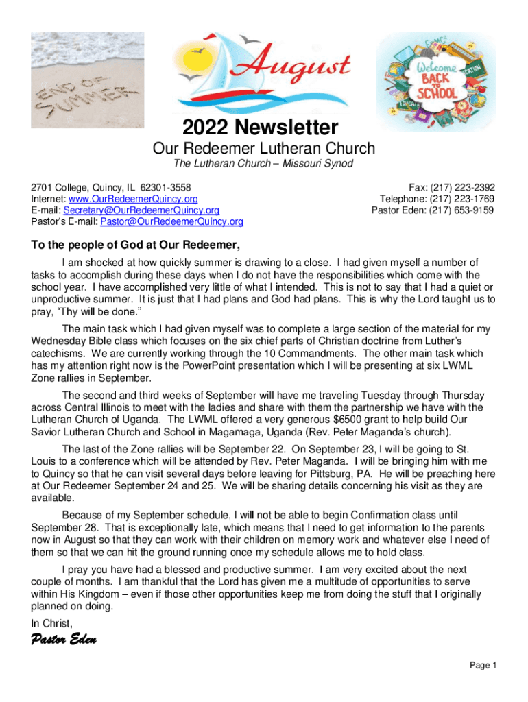2022 Newsletter Our Redeemer Lutheran Church The Lutheran Church Missouri Synod 2701 College, Quincy, IL 623013558 Internet: www.OurRedeemerQuincy.org Email: Secretary@OurRedeemerQuincy.org Pastors