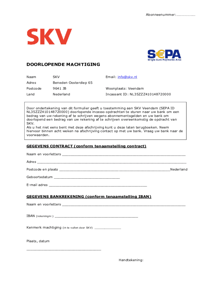 Abonneenummer:DOORLOPENDE MACHTIGING NaamSKVEmail: info@skv.nlAdresBeneden Oosterdiep 65Postcode9641 JBWoonplaats: VeendamLandNederlandIncassant ID: NL35ZZZ410148720000Door ondertekening van dit formulier