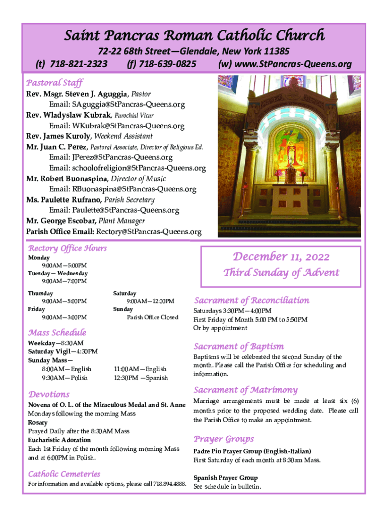 Saint Pancras Roman Catholic Church 7222 68th StreetGlendale, New York 11385 (t) 7188212323 (f) 7186390825 (w) www.StPancrasQueens.org Pastoral Staff Rev. Msgr. Steven J. Aguggia, Pastor Email: SAguggia@StPancrasQueens.org