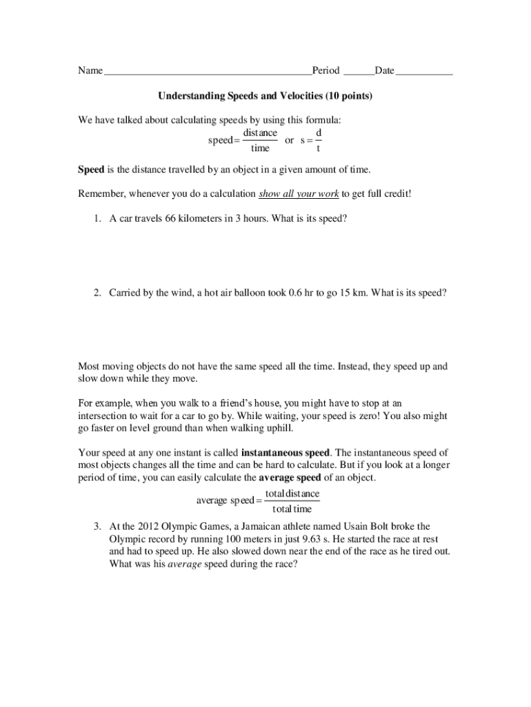 Name ___Period ___Date ___ Understanding Speeds and Velocities (10 points) We have talked about calculating speeds by using this formula: distance d speed or s time t Speed is the distance travelled