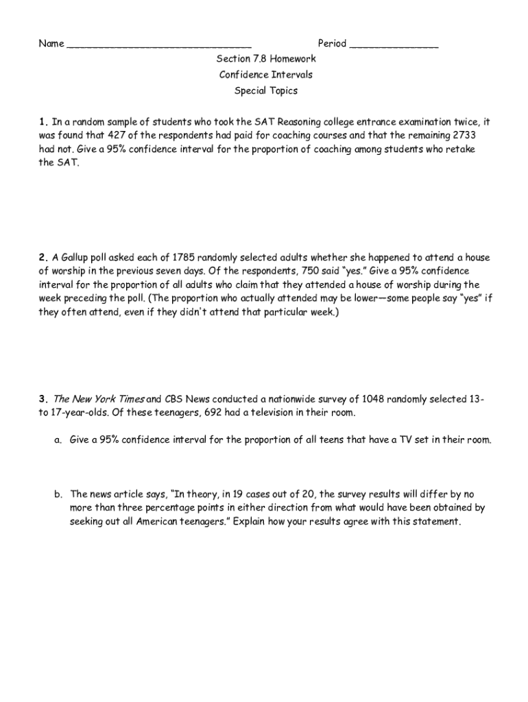 Name ___Period ___Section 7.8 Homework Confidence Intervals Special Topics 1. In a random sample of students who took the SAT Reasoning college entrance examination twice, it was found that 427 of