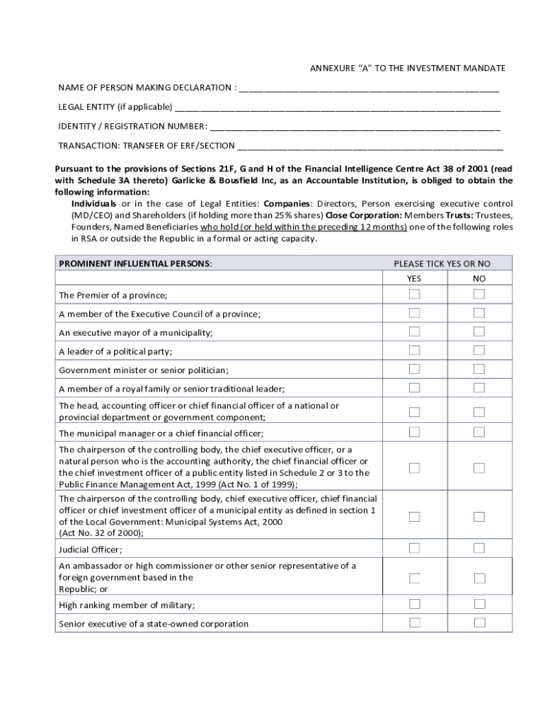 Appendix A TO THE INVESTMENT MANDATE NAME OF PERSON MAKING DECLARATION : ___ LEGAL ENTITY (if applicable) ___ IDENTITY / REGISTRATION NUMBER: ___ TRANSACTION: TRANSFER OF ERF/SECTION ___ Pursuant