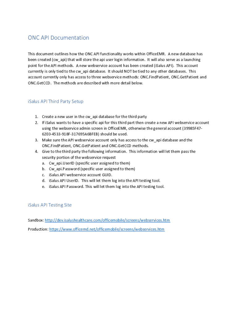 This document outlines how the ON API functionality works within Office EMR. A new database has