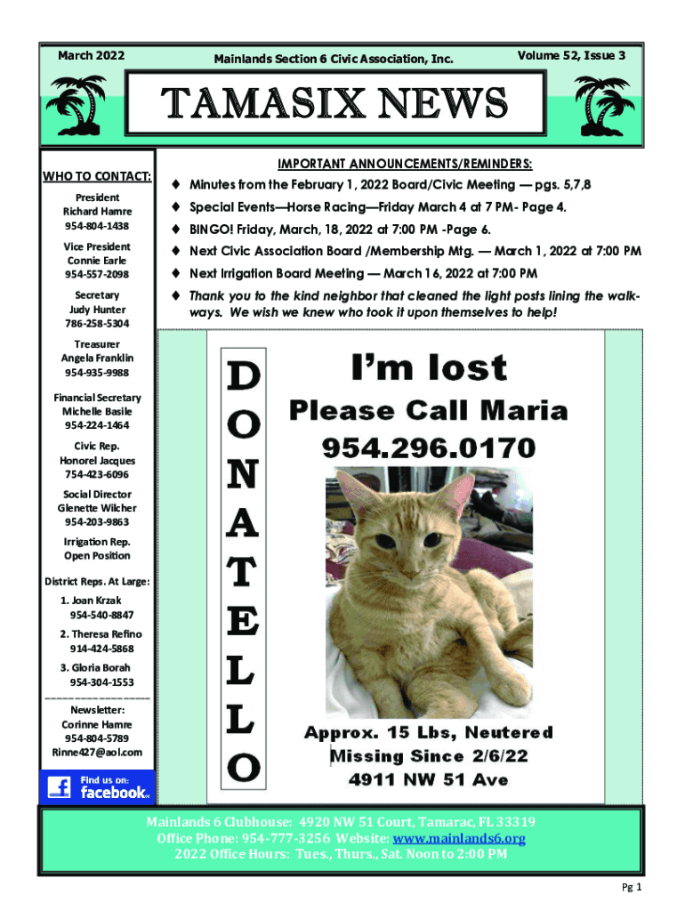 March 2022Mainlands Section 6 Civic Association, Inc.Volume 52, Issue 3TAMASIX NEWS WHO TO CONTACT: President Richard Hamre 9548041438 Vice President Connie Earle 9545572098 Secretary Judy Hunter
