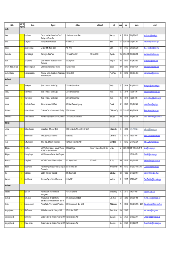 StateUSFW RegionNameAgencyaddressaddress2citystatezip96819phoneemailPacific Hawaii1Eric YuasaDept. of Land and Natural Res/Div. of Boating and Ocean Rec4 Sand Island Access RoadHonoluluHIIdaho1Kathy