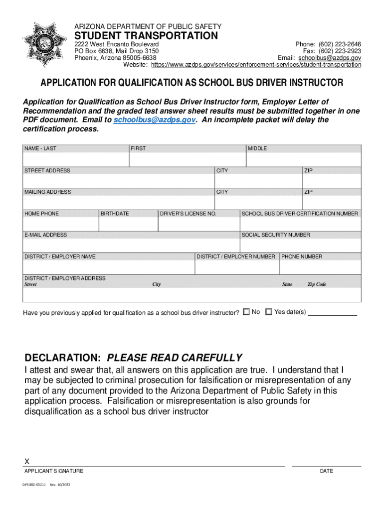 ARIZONA DEPARTMENT OF PUBLIC SAFETYSTUDENT TRANSPORTATIONPhone: (602) 2232646 2222 West Encanto Boulevard Fax: (602) 2232923 PO Box 6638, Mail Drop 3150 Email: schoolbus@azdps.gov Phoenix, Arizona