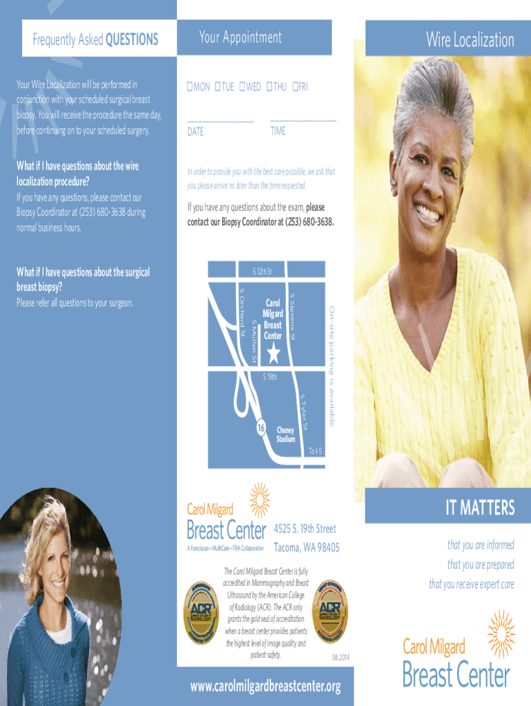Frequently Asked QuestionsWire LocalizationYour AppointmentYour Wire Localization will be performed in conjunction with your scheduled surgical breast biopsy. You will receive the procedure the same