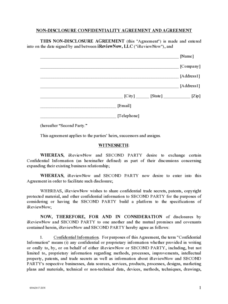 NONDISCLOSURE CONFIDENTIALITY AGREEMENT AND AGREEMENT THIS NONDISCLOSURE AGREEMENT (this \"Agreement\") is made and entered into on the date signed by and between iReviewNow, LLC (\"iReviewNow\"),