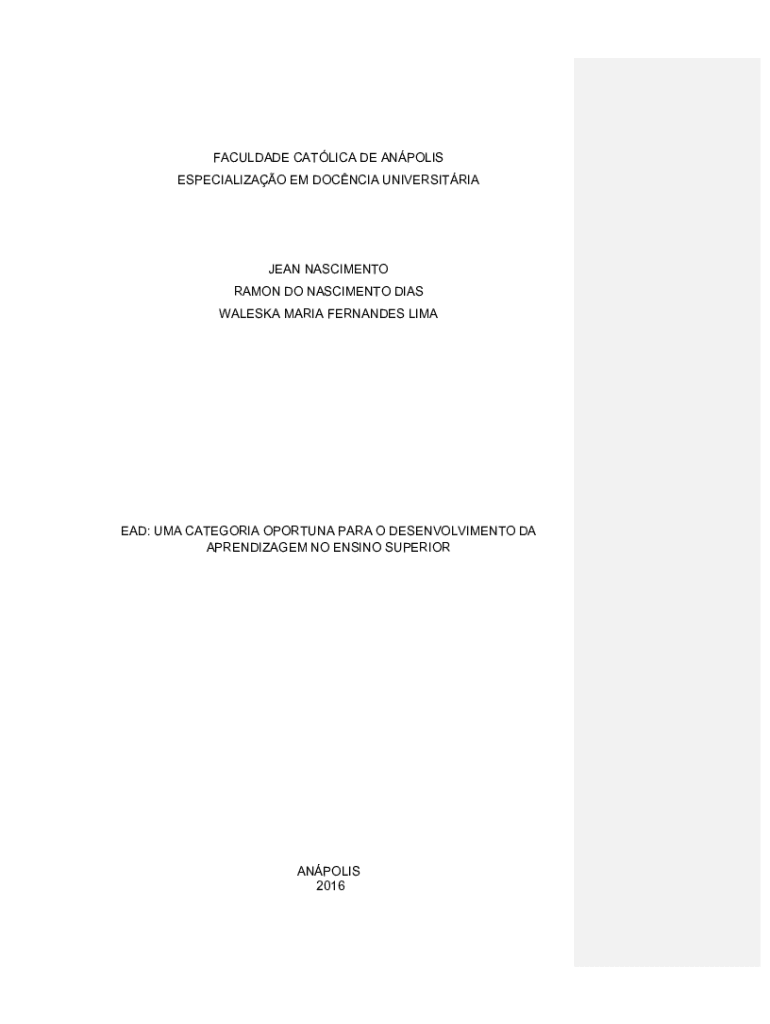 FACULDADE CATLICA DE ANPOLIS ESPECIALIZAO EM DOCNCIA UNIVERSITRIAJEAN NASCIMENTO RAMON DO NASCIMENTO DIAS WALESKA MARIA FERNANDES LIMAEAD: UMA CATEGORIA OPORTUNA PARA O DESENVOLVIMENTO DA APRENDIZAGEM