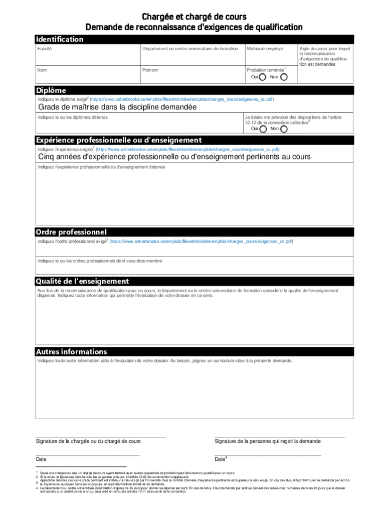 Charge et charg de cours Demande de reconnaissance d\'exigences de qualification Identification FacultDpartement ou centre universitaire de formationMatricule employSigle du cours pour lequel la reconnaissance