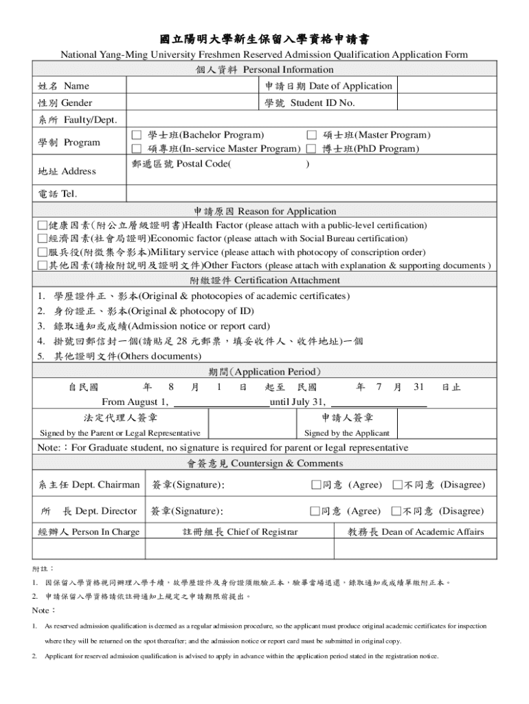 National YangMing University Freshmen Reserved Admission Qualification Application Form
