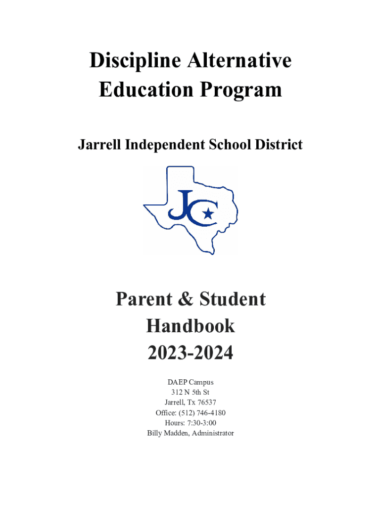 Discipline Alternative Education Program Jarrell Independent School DistrictParent & Student Handbook 20232024 DAEP Campus 312 N 5th St Jarrell, Tx 76537 Office: (512) 7464180 Hours: 7:303:00 Billy