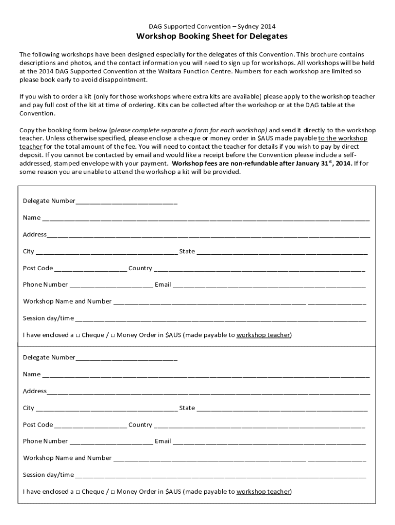 DAG Supported Convention Sydney 2014Workshop Booking Sheet for Delegates The following workshops have been designed especially for the delegates of this Convention. This brochure contains descriptions