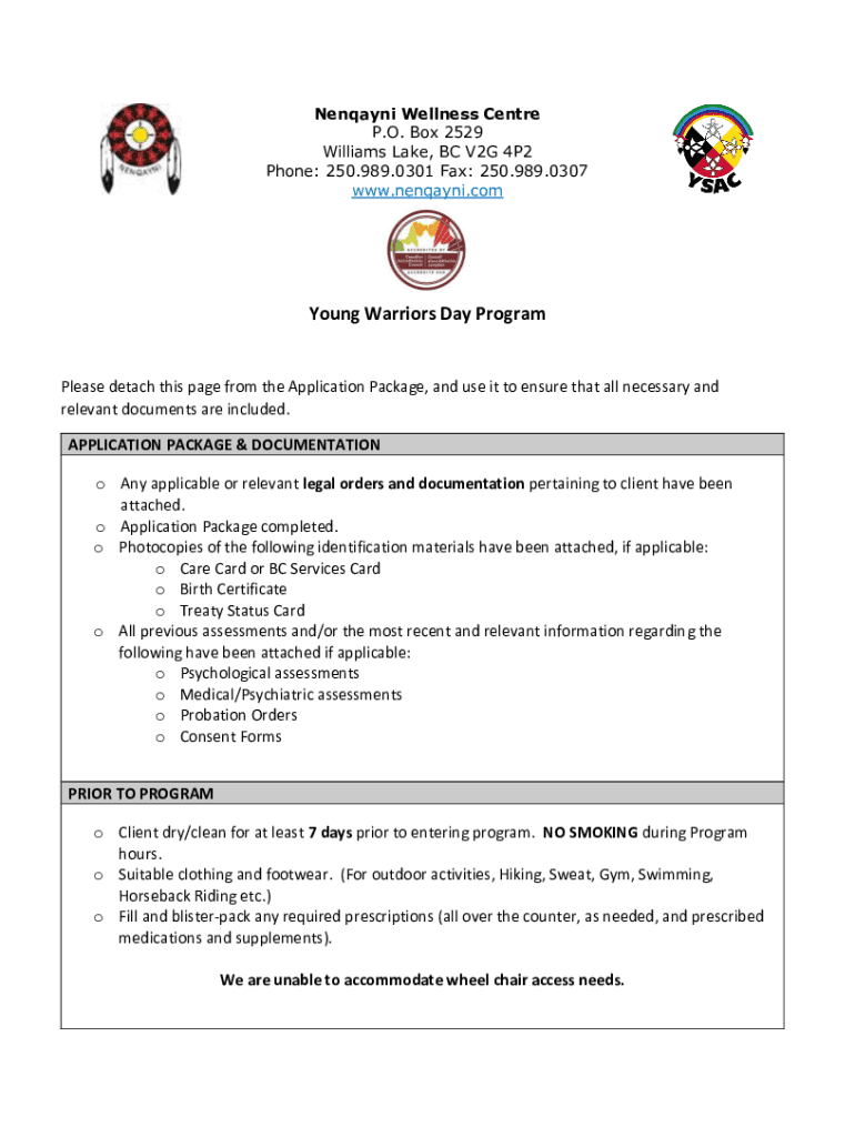 Nenqayni Wellness Centre P.O. Box 2529 Williams Lake, BC V2G 4P2 Phone: 250.989.0301 Fax: 250.989.0307 www.nenqayni.comYoung Warriors Day ProgramPlease detach this page from the Application Package,