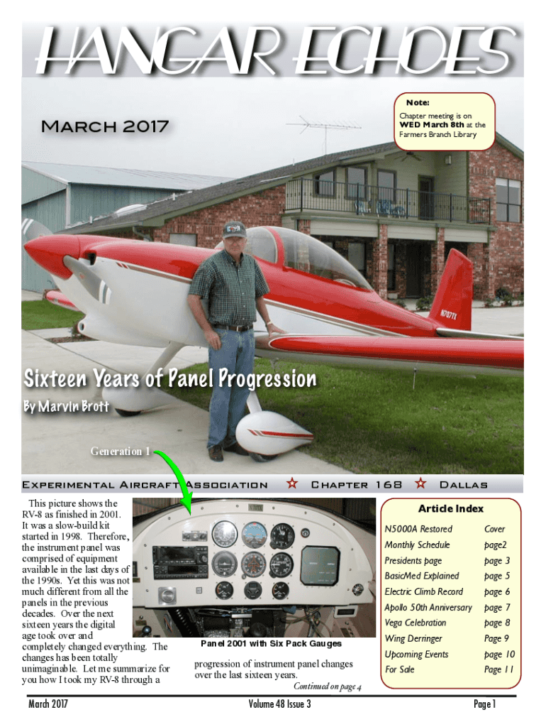 HANGAR ECHOES Note: Chapter meeting is on WED March 8th at the Farmers Branch LibraryMarch 2017Sixteen Years of Panel Progression By Mar vin Brott Generation 1Experimental Aircraft Association! This
