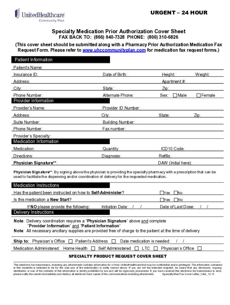 URGENT 24 HOURSpecialty Medication Prior Authorization Cover Sheet FAX BACK TO: (866) 9407328 PHONE: (800) 3106826 (This cover sheet should be submitted along with a Pharmacy Prior Authorization Medication