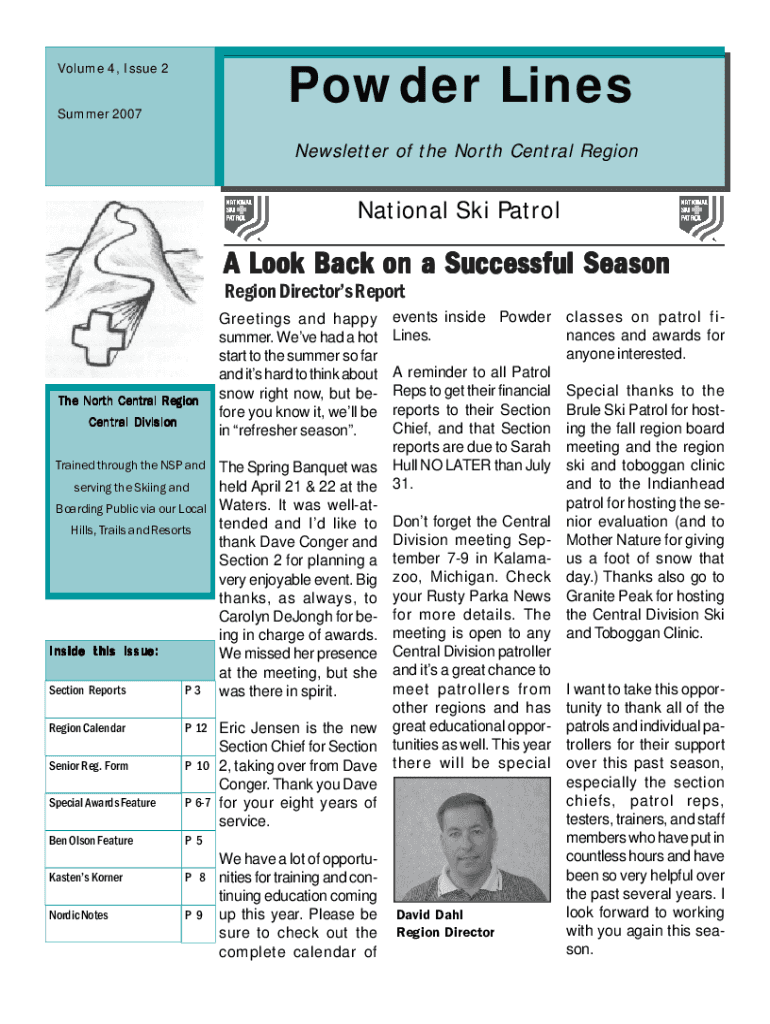 Powder LinesVolume 4, Issue 2 Summer 2007Newsletter of the North Central RegionNational Ski PatrolA Look Back on a Successful Season Region Directors ReportThe North Central Region Central DivisionGreetings