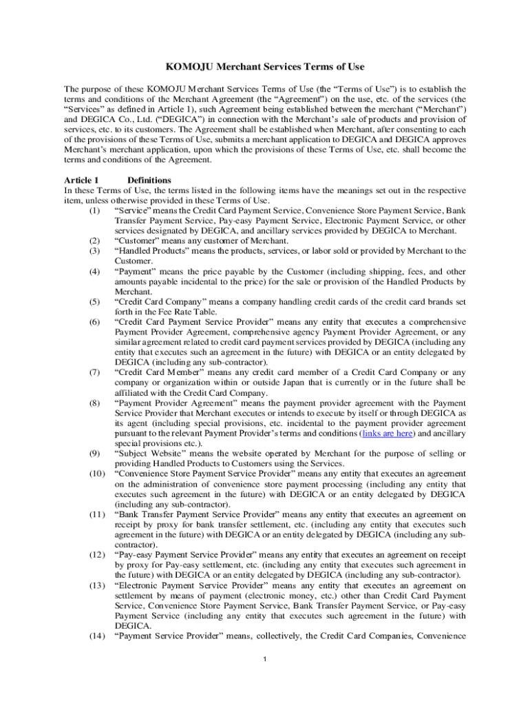 KOMOJU Merchant Services Terms of Use The purpose of these KOMOJU Merchant Services Terms of Use (the Terms of Use) is to establish the terms and conditions of the Merchant Agreement (the Agreement)