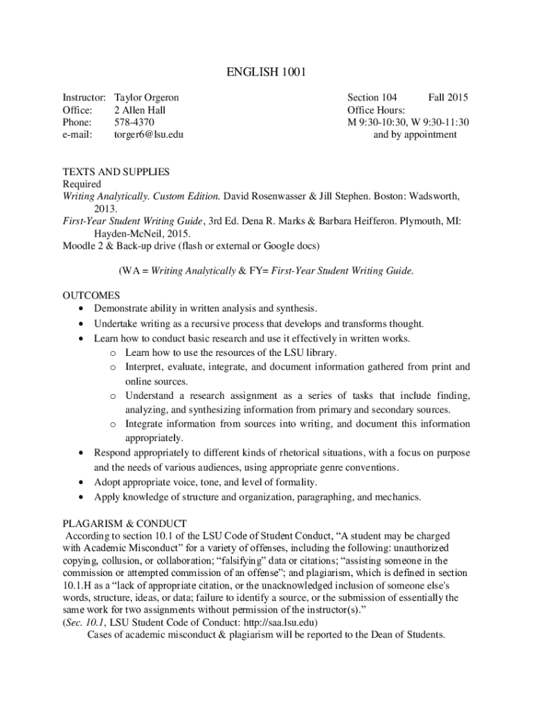 ENGLISH 1001 Instructor: Office: Phone: email:Taylor Orgeron 2 Allen Hall 5784370 torger6@lsu.eduSection 104 Fall 2015 Office Hours: M 9:3010:30, W 9:3011:30 and by appointmentTEXTS AND SUPPLIES Required