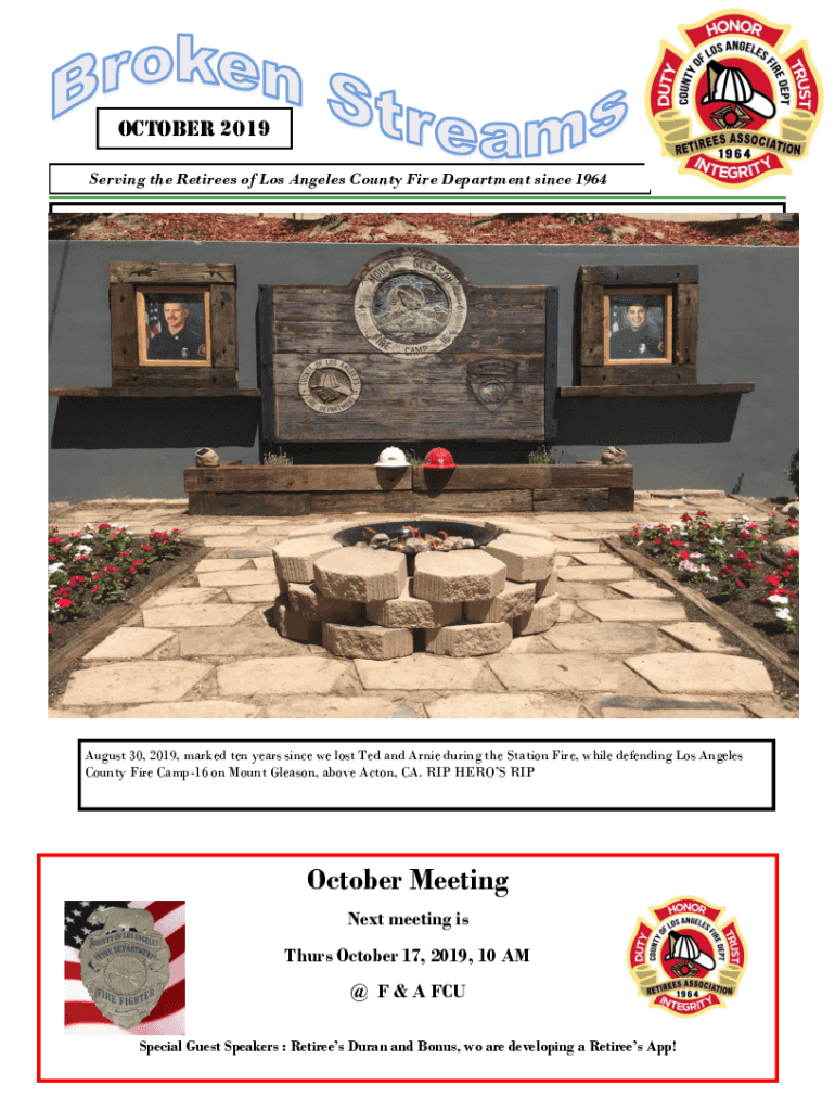 OCTOBER 2019 Serving the Retirees of Los Angeles County Fire Department since 1964County of Los Angeles Fire Department Retirees AssociationAugust 30, 2019, marked ten years since we lost Ted and