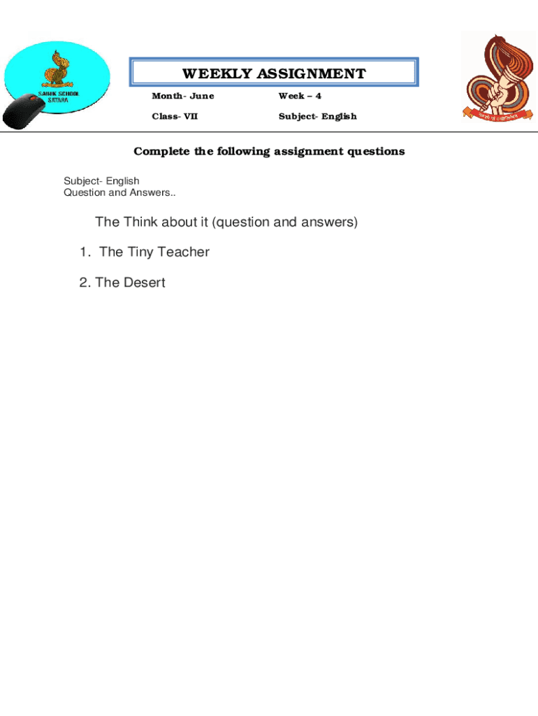WEEKLY ASSIGNMENT Month JuneWeek 4Class VIISubject EnglishComplete the following assignment questions Subject English Question and Answers..The Think about it (question and answers) 1. The Tiny Teacher