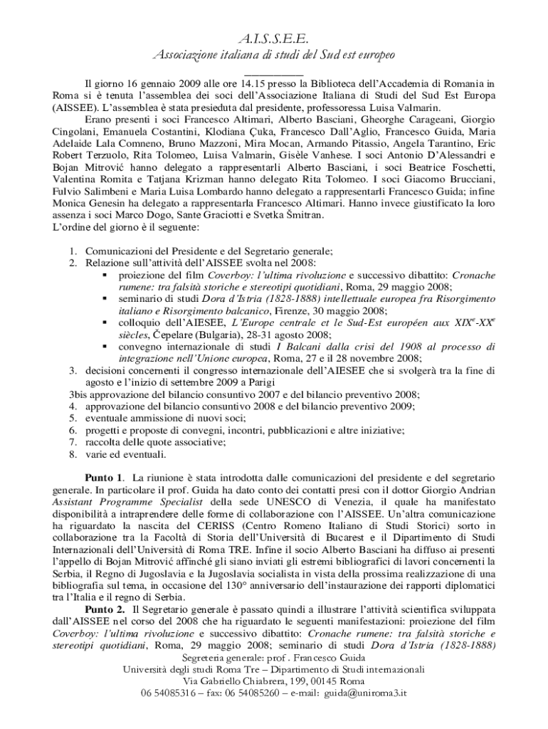 A.I.S.S.E.E. Associazione italiana di studi del Sud est europeo ___ Il giorno 16 gennaio 2009 alle ore 14.15 presso la Biblioteca dellAccademia di Romania in Roma si tenuta lassemblea dei soci dellAssociazione