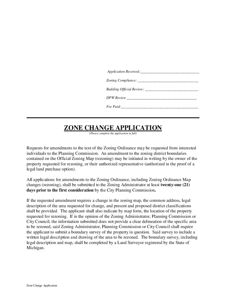 Application Received:___ Zoning Compliance: ___ Building Official Review: ___ DPW Review ___ Fee Paid:___ZONE CHANGE APPLICATION (Please complete the application in full)Requests for amendments to