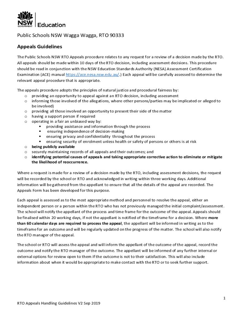 Public Schools NSW Wagga Wagga, RTO 90333 Appeals Guidelines The Public Schools NSW RTO Appeals procedure relates to any request for a review of a decision made by the RTO. All appeals should be made
