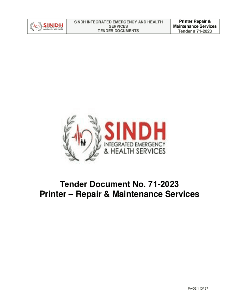 SINDH INTEGRATED EMERGENCY AND HEALTH SERVICES TENDER DOCUMENTSPrinter Repair & Maintenance Services Tender # 712023Tender Document No. 712023 Printer Repair & Maintenance ServicesPAGE 1 OF 37SINDH