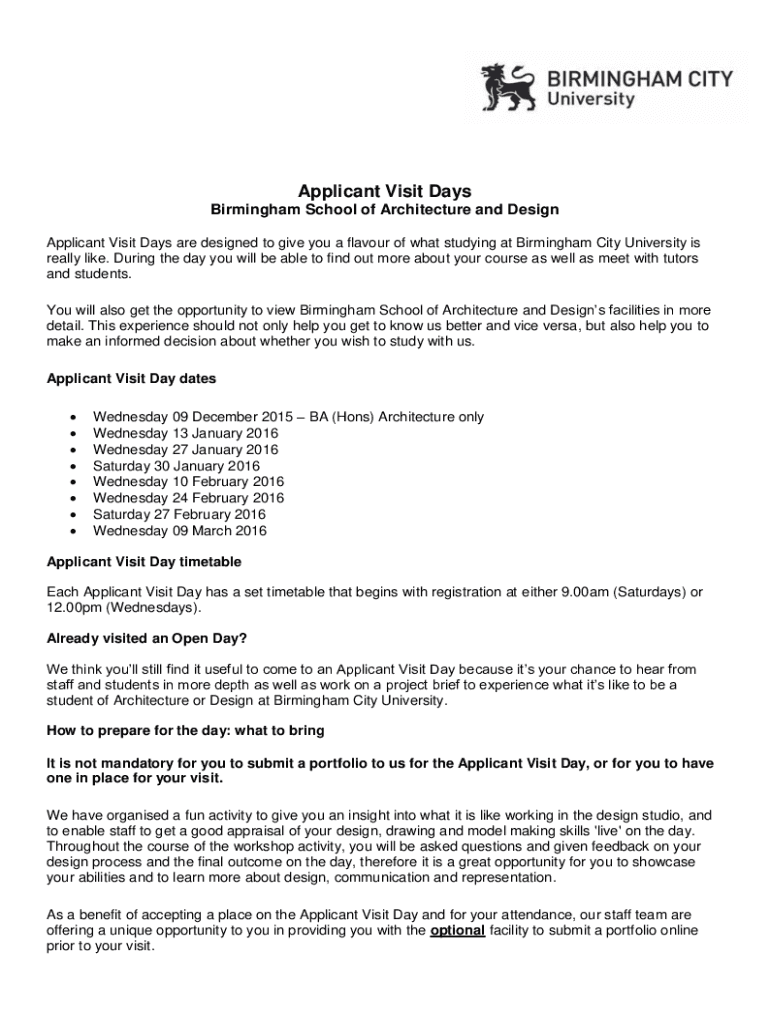 Applicant Visit Days Birmingham School of Architecture and Design Applicant Visit Days are designed to give you a flavour of what studying at Birmingham City University is really like. During the