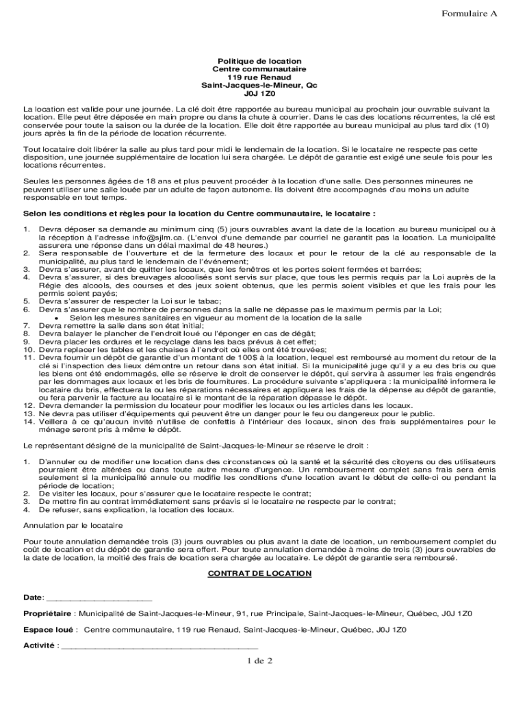 Formulaire APolitique de location Centre communautaire 119 rue Renaud SaintJacquesleMineur, Qc J0J 1Z0 La location est valide pour une journe. La cl doit tre rapporte au bureau municipal au prochain