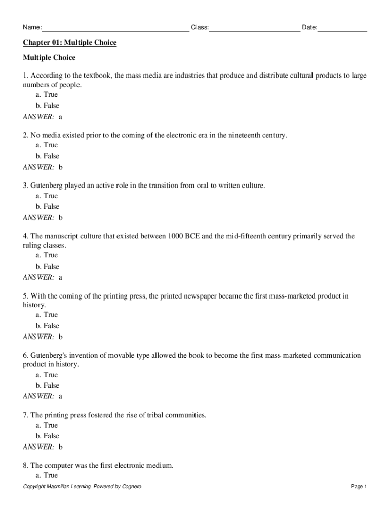 Name:Class:Date:Chapter 01: Multiple Choice Multiple Choice 1. According to the textbook, the mass media are industries that produce and distribute cultural products to large numbers of people. a.