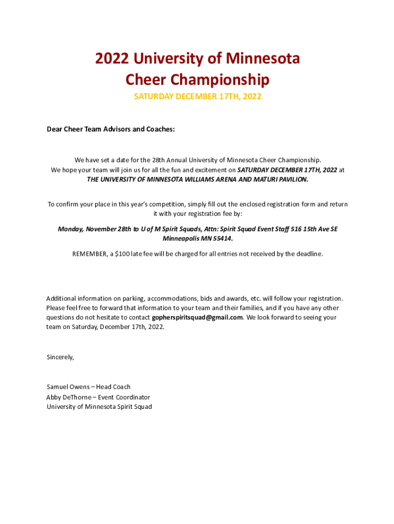 SATURDAY, DECEMBER 17TH, 2022Dear Cheer Team Advisors and Coaches:We have set a date for the 28th Annual University of Minnesota Cheer Championship.