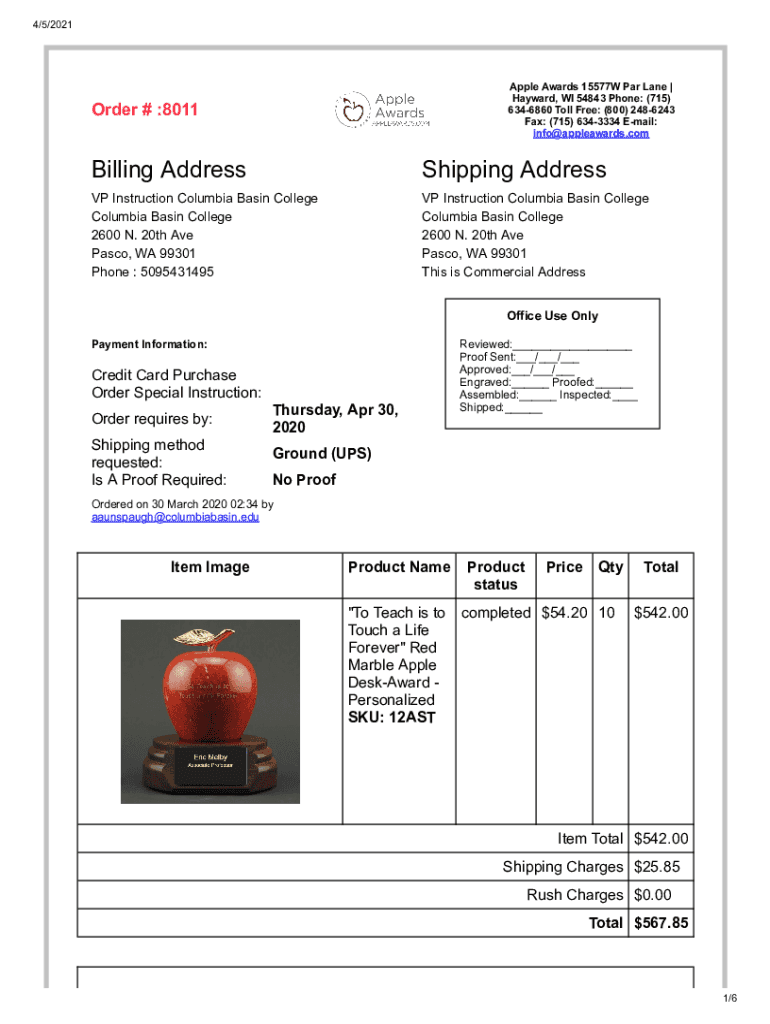 4/5/2021Apple Awards 15577W Par Lane | Hayward, WI 54843 Phone: (715) 6346860 Toll Free: (800) 2486243 Fax: (715) 6343334 Email: info@appleawards.comOrder # :8011Billing AddressShipping AddressVP