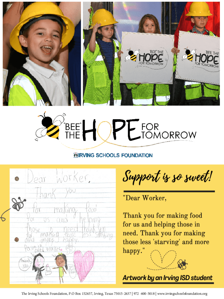 Support is so sweet! \”Dear Worker, Thank you for making food for us and helping those in need. Thank you for making those less \'starving\' and more happy.\”Artwork by an Irving ISD students