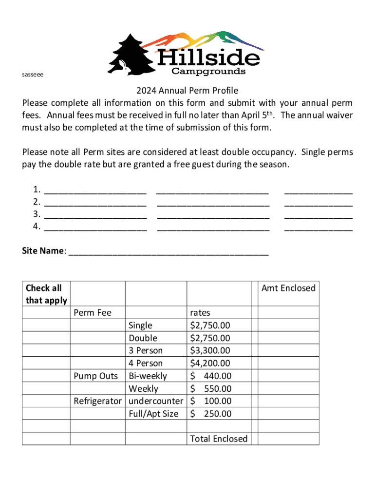 sasseee2024AnnualPermProfile Please complete all information on this form and submit with your annual perm fees.AnnualfeesmustbereceivedinfullnolaterthanApril5th.Theannualwaiver mustalsobecompletedatthetimeofsubmissionofthisform.