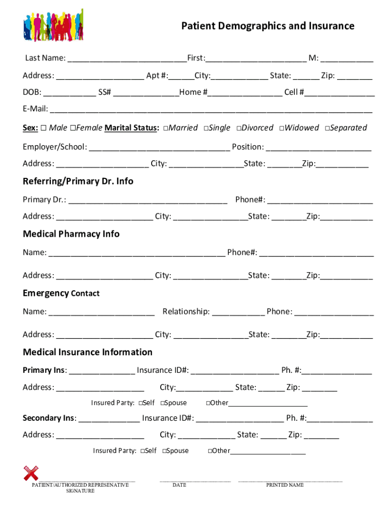 Patient Demographics and Insurance Last Name: ___ ___First:___ ___ M: ___ Address: ___ Apt #:___City:___ State: ___ Zip: ___ DOB: ___ __ SS# ___ ___Home Home #___ Cell #___ EMail: Mail: ___ Sex: Male