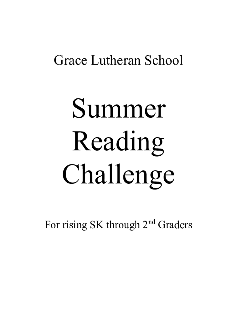 Grace Lutheran SchoolSummer Reading Challenge For rising SK through 2nd GradersSummer Reading Challenge for rising SK to 2 nd Graders As you finish a challenge, write the date of when you completed