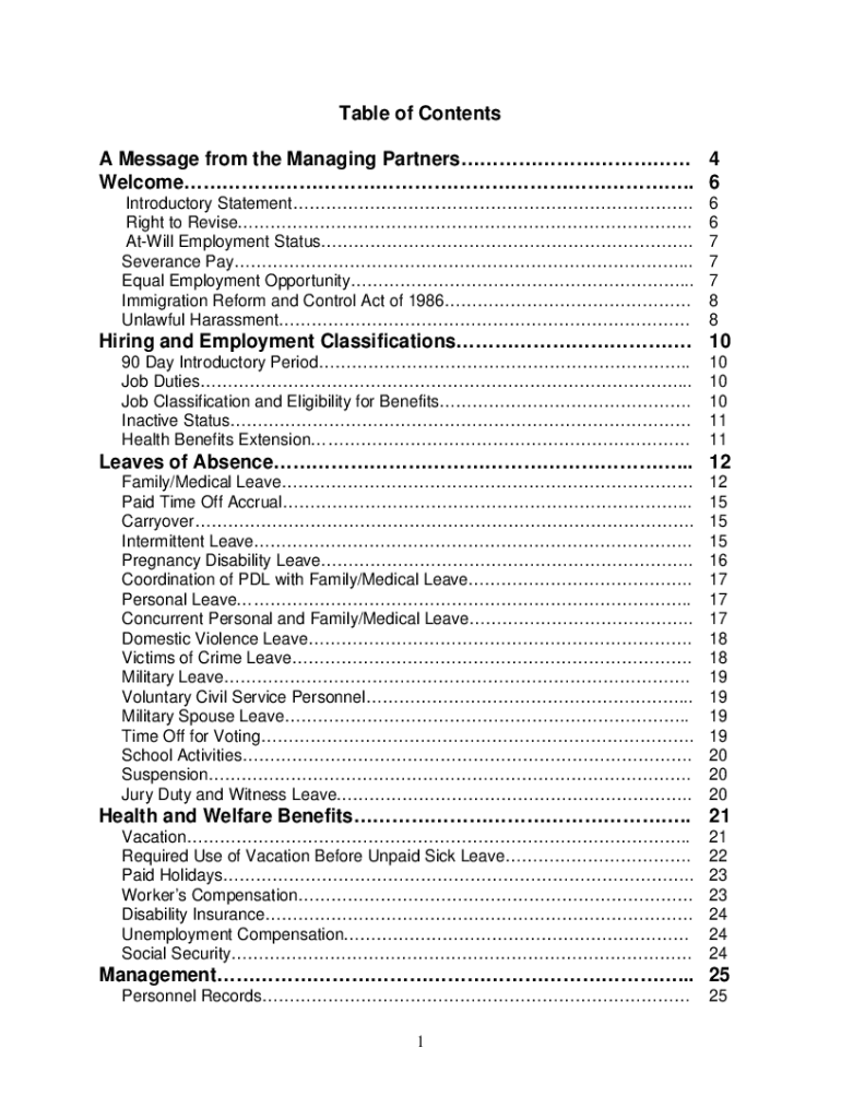 Table of Contents A Message from the Managing Partners 4 Welcome.. 6 Introductory Statement. Right to Revise.. AtWill Employment Status.. Severance Pay