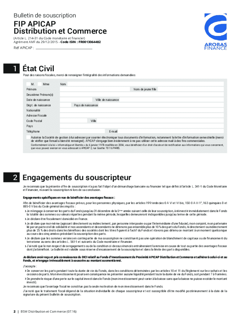 Bulletin de souscriptionFIP APICAP Distribution et Commerce (Article L. 21431 du Code montaire et financier) Agrment AMF du 29/12/2015 Code ISIN : FR0013064482Rf APICAP:1tat CivilPour des raisons