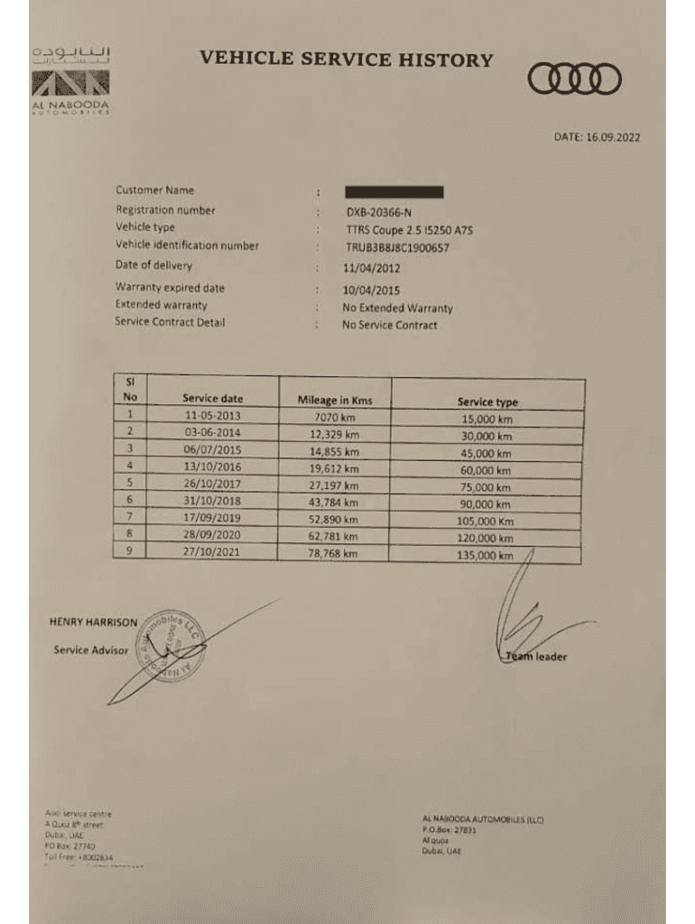 The genuine parts portalVehicle identificationVehicle data AttributeVehicle dataVehicle Identification No.TRUB3B8J8C1900657ModelAudi TTRS Coupe Quattro 2.5 TTRSDate of production19.09.2011Year2012Sales